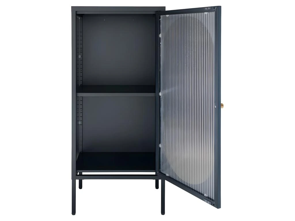 Ce meuble en métal noir mesure 110 cm en hauteur, 50 cm en largeur et 35 cm en profondeur. Il est doté d’une porte en verre strié à bords arrondis qui apporte un côté un peu vintage, tandis que les lignes simples du meuble le rendent plutôt contemporain. Il est pourvu d’une petite poignée de porte dorée discrète et de pieds fins qui allègent l’ensemble. À l’intérieur, une étagère sépare 2 grands espaces de rangement.