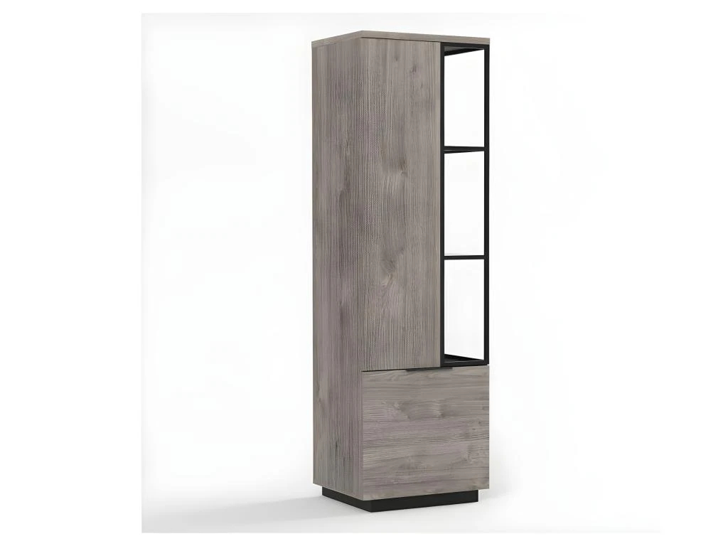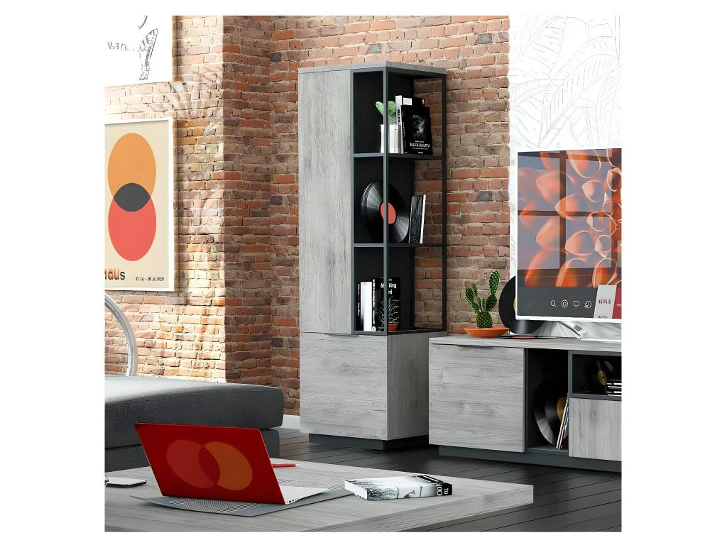 Mariant une finition teinte bois gris au rendu plus vrai que nature et des éléments en métal laqué noir cette bibliothèque ouverte à la proportion parfaite ne manquera pas de moderniser votre salon tout en se mariant avec tous les styles de mobilier.