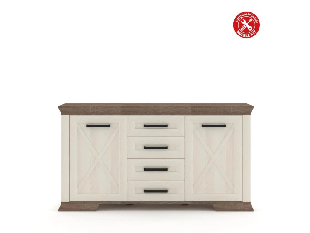 Buffet Haut Avec LED Collection KILES Deux Portes. Coloris Blanc Et Chêne. Porte Vitrée à Droite