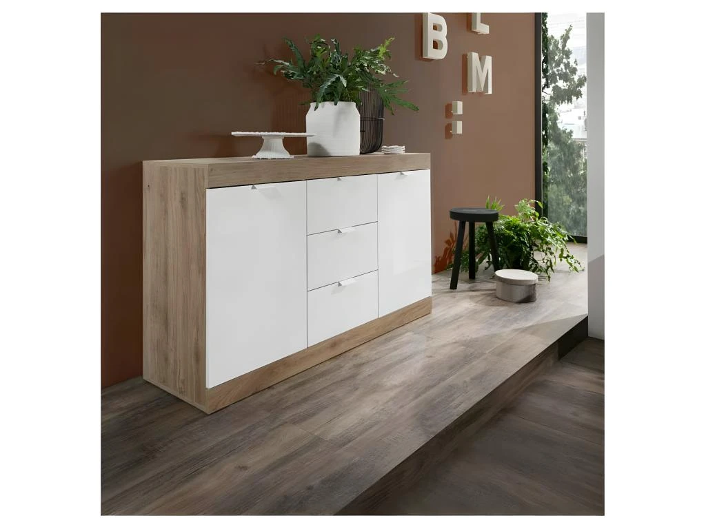 Mettant en avant des ouvrants laqués blanc brillant et des traverses revêtues d’une finition Chêne naturel au rendu plus vrai que nature cette belle enfilade à la dimension optimisée promet de moderniser sagement votre coin repas.
