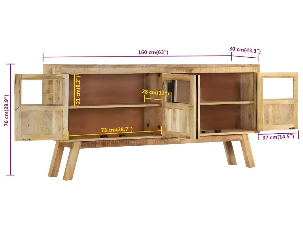- Matériau : bois de manguier massif avec une finition naturelle, métal, verre