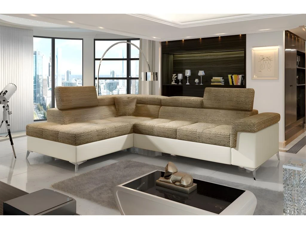 Ce superbe canapé d’angle convertible en tissu de haute qualité et simili – ERMAN – C’est le parfait moyen pour réussir sa décoration intérieure et profiter d’un confort très agréable. Confort et design élégant ainsi que son grand espace de couchage sont les atouts de ce canapé pour combler les plus exigeants. Ce canapé d’angle de style contemporain conçu pour répondre aux plus hauts niveaux de confort. Tissu très agréable de la catégorie luxe. Assise très confortable grâce à son excellent rembourrage. Très bonne qualité de fabrication. Fabrication européenne. Tissu de la catégorie la plus élevée. Avec ses jolis pieds en métal chromé poli. L’assise spacieuse, le dossier ergonomique avec appuie-tête réglables et un large accoudoir vous procureront des moments de détente dans le plus grand confort.