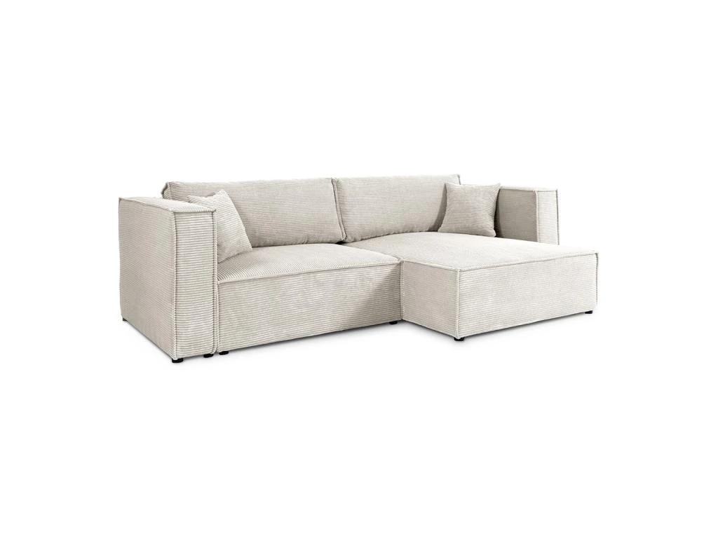 Matériaux : Tissu velours côtelé 100% Polyester – Rembourrage de l’assise : mousse de polyuréthane T28 épaisseur 11 cm et ressorts ondulés – Rembourrage du dossier : mousse T25 épaisseur 8 cm – Piétement ABS noir