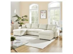 Canapé D’angle Convertible Panoramique + 2 Coffres De Rangement + 2 Coussins – Tissu Beige – L 300 X P 148 X H 83 Cm – OWENS