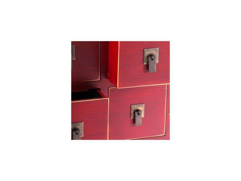 La teinte rouge se marie à la quincaillerie dorée, parfaitement raccord avec le style oriental de ce meuble multifonction sobre et élégant.