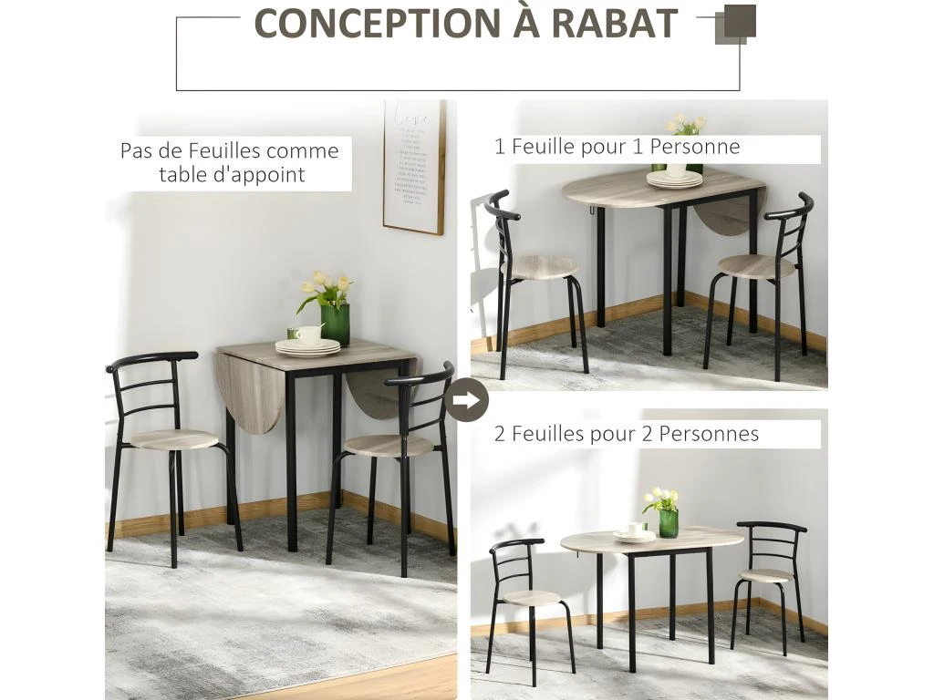 – Ensemble table avec 2 chaises, idéal pour une adaptation parfaite à chacun de vos espaces intérieurs : salle à manger, salon, cuisine, etc.