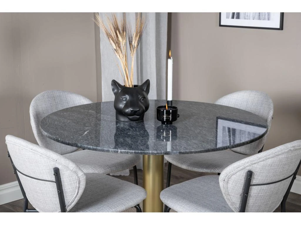 Estelle Table de salle à manger 60-19931-568. Øcm 106. Table de salle à manger cm: L106 x P106 x H75. Table de salle à manger: Marbré, Acier . Vault Chaise 60-15022-855. Numéro 4 . Chaise cm: L46 x H80 x P61,5. Hauteur d’assise cm: 49. Profondeur d’assise cm: 45. Largeur d’assise cm: 46. Poids maximal kg.: 150. Tissu. Chaise: 100% Polyester, Contreplaqué, Mousse, Acier .