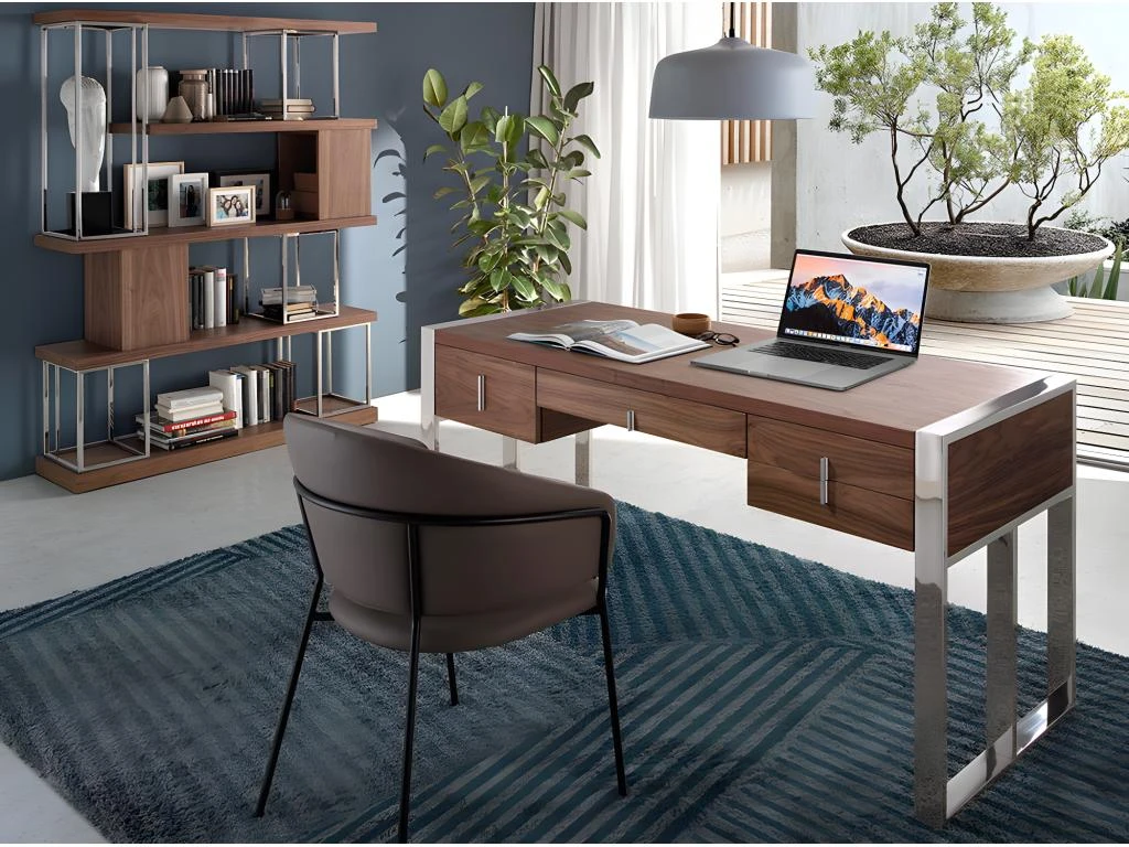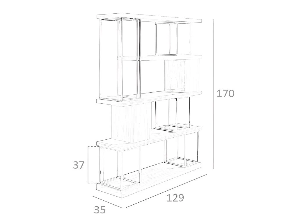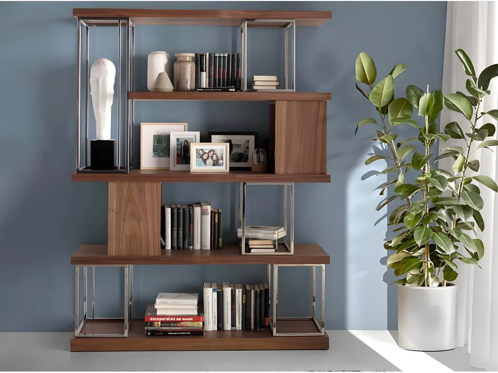Étagère design moderne avec étagères en bois plaqué noyer naturel de 0,5mm d’épaisseur et structure en acier inoxydable chromé de 22 microns. Son design élégant apporte une touche originale et chaleureuse à votre intérieur, préservant l’ordre dans votre espace de travail