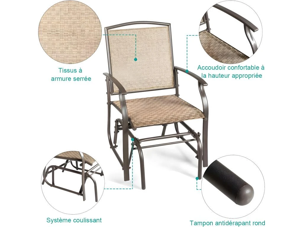 - 【Structure en acier robuste et durable】 : Fabriqué en acier robuste, la structure de la chaise à bascule est robuste et durable, de sorte que l’ensemble peut être utilisé pendant longtemps. Avec un revêtement enduit de poudre sur le tube en acier, la chaise peut supporter un vent modéré ou une pluie modérée dans l’espace extérieur.