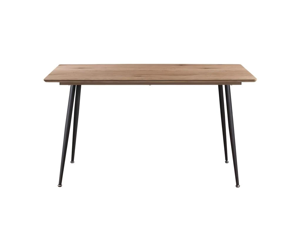 Plateau en panneaux de particules et piètement en métal noir, revêtement papier décor bois. Chaises Tissu Polyester et pieds métal.