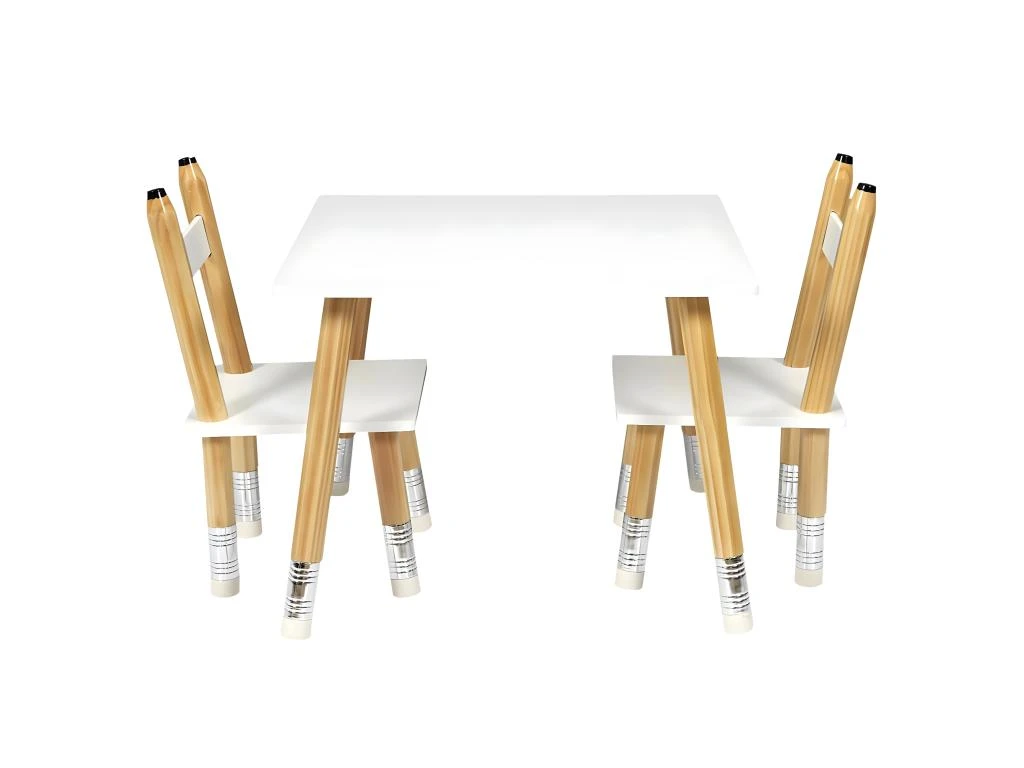Un ensemble atypique pour décorer la chambre de votre enfant. Outre le style scandinave épuré, la table et les chaises vous taperont immédiatement dans l’œil avec leurs piétements en forme de crayon à papier.