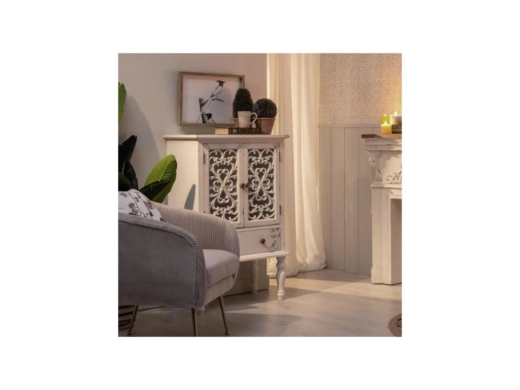 Très nettement inspiré de la tendance Shabby chic ce meuble de complément réalisé en bois de Pin propose un design emprunt de classicisme remis au goût du jour grâce à une patine copie d’ancien.