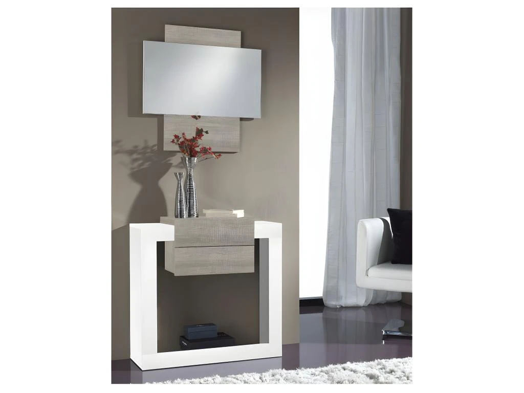 Ce meuble d’entrée épuré est composé de deux tiroirs et une grande niche de rangement. Le meuble est accompagné d’un miroir tendance sur fond couleur chêne clair.