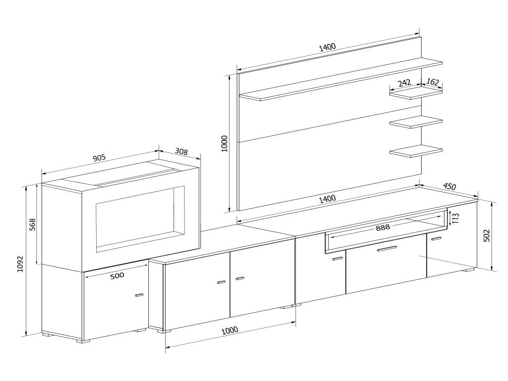 Sejour forme de deux modules bas, 1 panneau superieur avec etageres et l’etonnant module bas avec cheminee electrique.