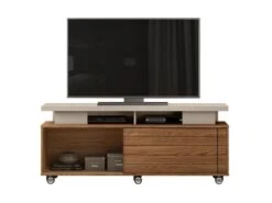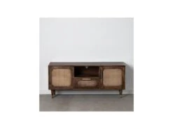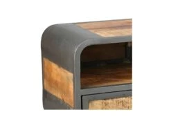 Meuble TV Bois 2 Tiroirs Et 2 Espaces Ouverts De Rangement Insert Acier Poli Pieds Bois