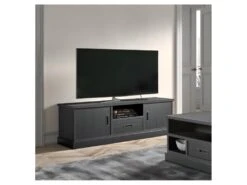 Robuste et stable ce meuble est conçu pour supporter un écran géant, il offre en outre deux grands volumes de rangement derrière 2 portes, une niche munie d’un passe câbles et un tiroir idéal pour déposer les télécommandes.