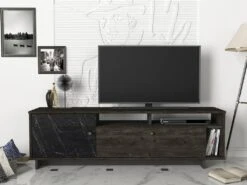 N’attendez plus et optez pour le meuble TV ETALA ! Avec ses multiples rangements, ce banc TV vous permettra d’optimiser l’espace de votre salon. Ses teintes sobres lui confèrent une certaine intemporalité. Il n’en reste pas moins tendance avec son effet marbre noir.