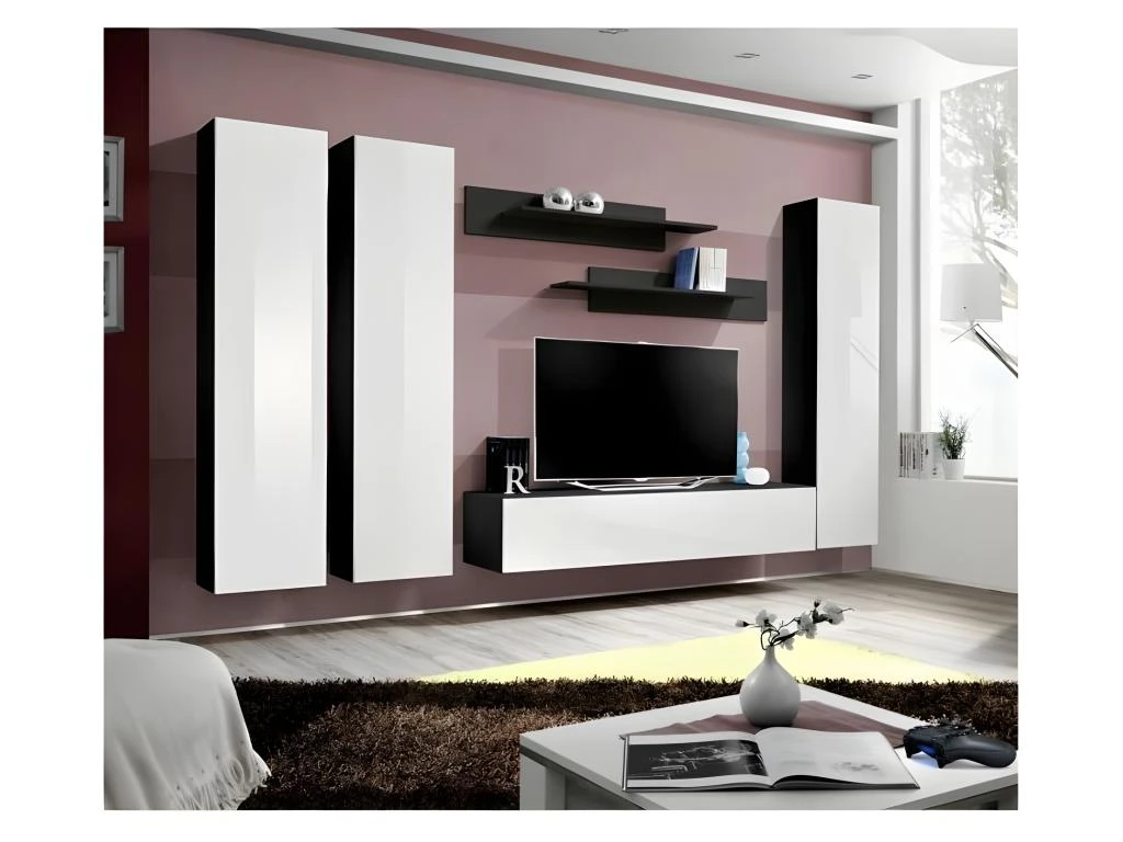 Meuble TV mural suspendu FLY C1 noir et blanc. Structure: Panneaux de particules + MDF. Composition: 1 banc TV avec 3 compartiments: 160 x 30 x 40 cm, 3 colonnes avec 3 étagères chacune + LED: 40 x 170 x 29 cm, 2 étagères: 100-120 x 20 x 20 cm. Coloris: corps noir mat, façades blanches brillantes. Système d’ouverture des portes PUSH TO OPEN. 18 combinaisons disponibles pour cette référence.