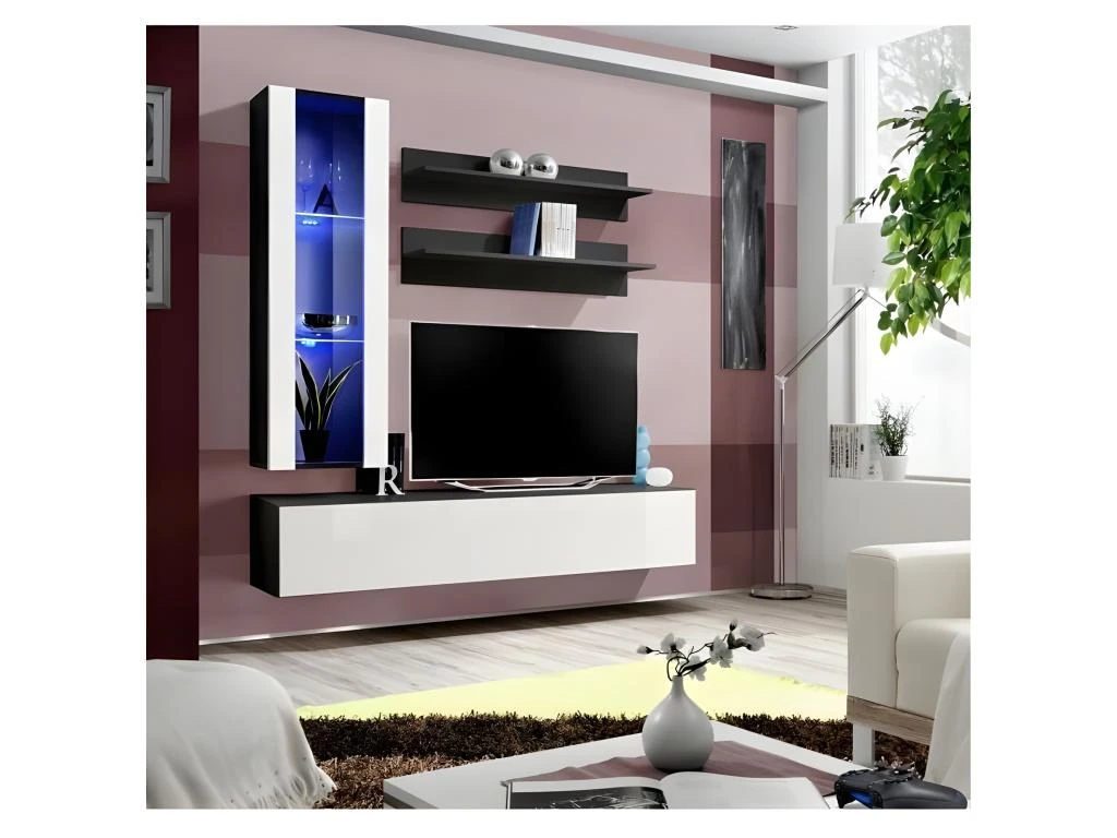Meuble TV mural suspendu FLY H2 noir et blanc. Structure: Panneaux de particules + MDF. Composition: 1 banc TV avec 3 compartiments: 160 x 30 x 40 cm, 1 colonne vitrée avec 2 étagères + LED: 40 x 126 x 29 cm, 2 étagères: 100-120 x 20 x 20 cm. Coloris: corps noir mat, façades blanches brillantes. Système d’ouverture des portes PUSH TO OPEN. 12 combinaisons disponibles pour cette référence.