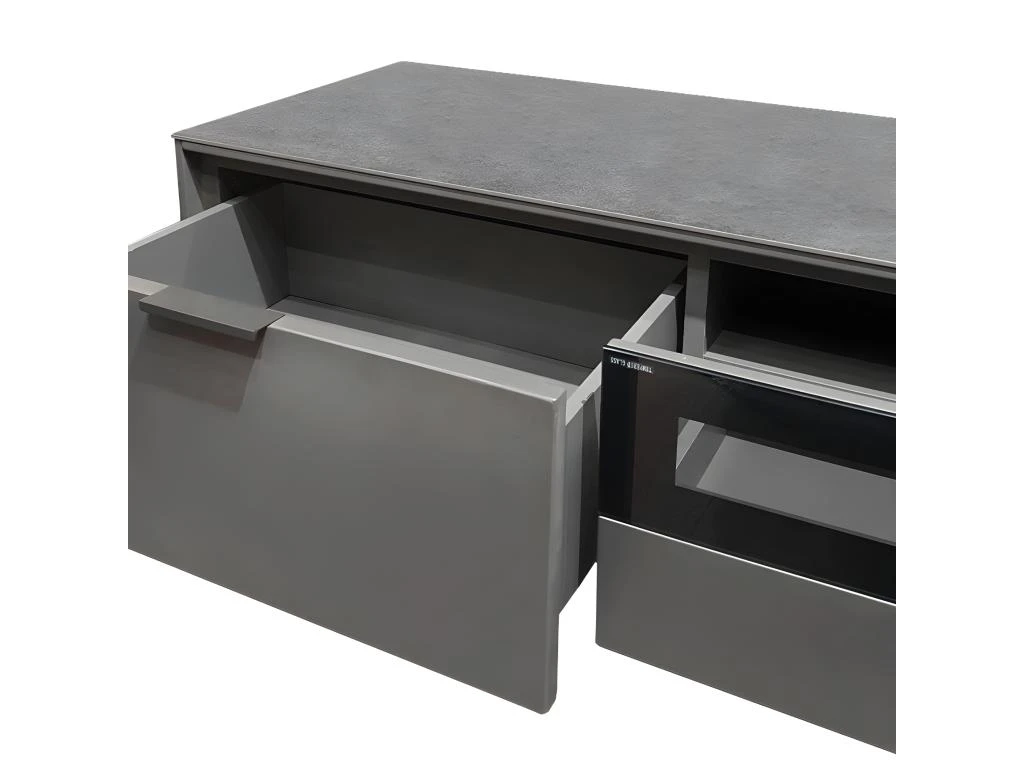 - PARTIE CENTRALE : 1 TIROIR avec façade verre trempé et ouverture « push to open » divisé en 2 compartiments : TIROIR : Hauteur 5 cm x Profondeur 33.5 cm X Largeur 46 cm / NICHE : Hauteur 9 cm x Profondeur 37.5 cm X Largeur 50 cm (dimensions intérieures).