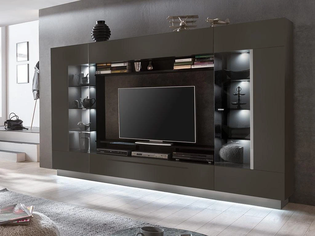 Les LEDs finement disposées sur les étagères ainsi que les portes laquées de ce mur TV lui confèrent un aspect tendance et élégant. Grâce à son design épuré, il épousera parfaitement les formes de votre télévision et des objets que vous disposerez sur ses nombreuses étagères.