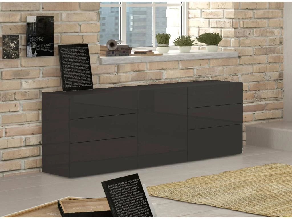STRUCTURE ET UTILISATION – Meuble de salon pratique et peu encombrant structuré avec une porte centrale battante et six tiroirs, à l’intérieur avec une étagère confortable – Les portes et les tiroirs sont sans poignées, tous deux équipés de charnières solides et de guides métalliques – L’étagère supérieure est parfaite pour accueillir votre téléviseur ou vos bibelots préférés.