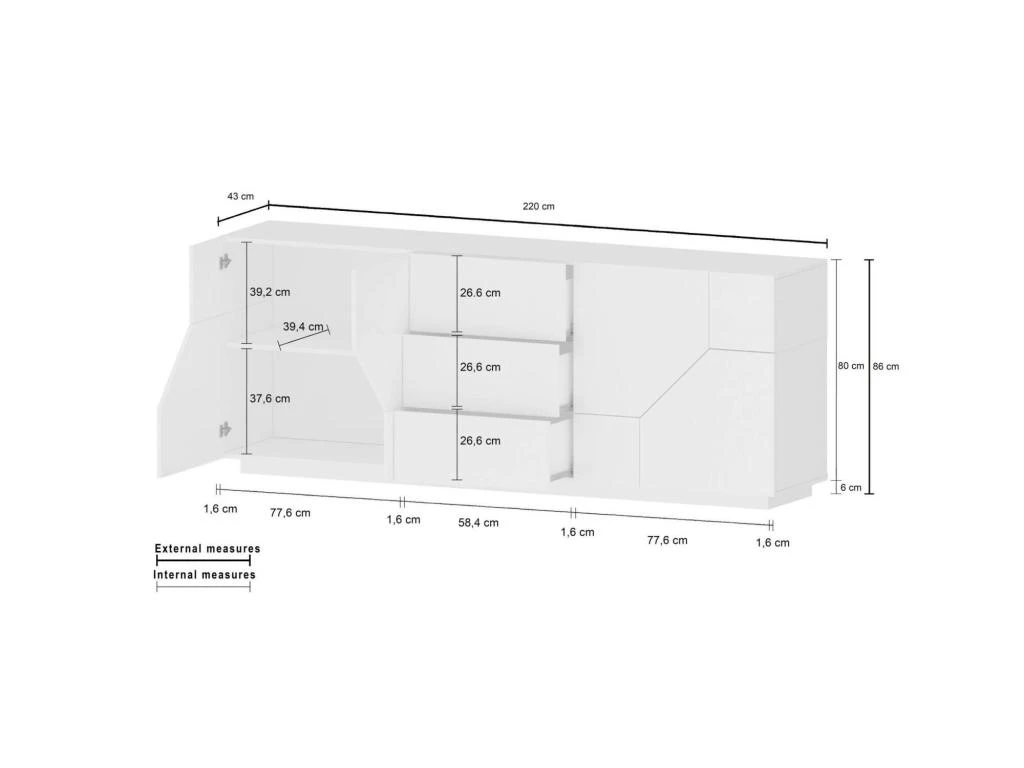 DIMENSIONS EN CM – Buffet : Longueur : 220,1 Largeur : 43 Hauteur : 86