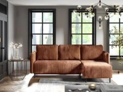Canapé D’angle Réversible Et Convertible 3 Places Avec Coffre Robin Velours Côtelé Orange Brique