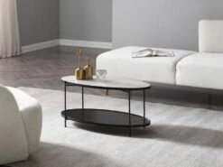Table Basse Double Plateau En CĂ©ramique Et Bois D’hĂ©vĂ©a – Effet Marbre Blanc Et Noir – FUDILA