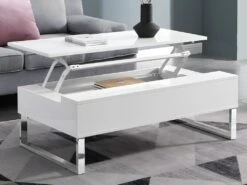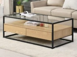 Table Basse Avec 2 Plateaux Relevables Et 1 Porte – MDF Et Acier – Naturel Et Noir – KAYLINO