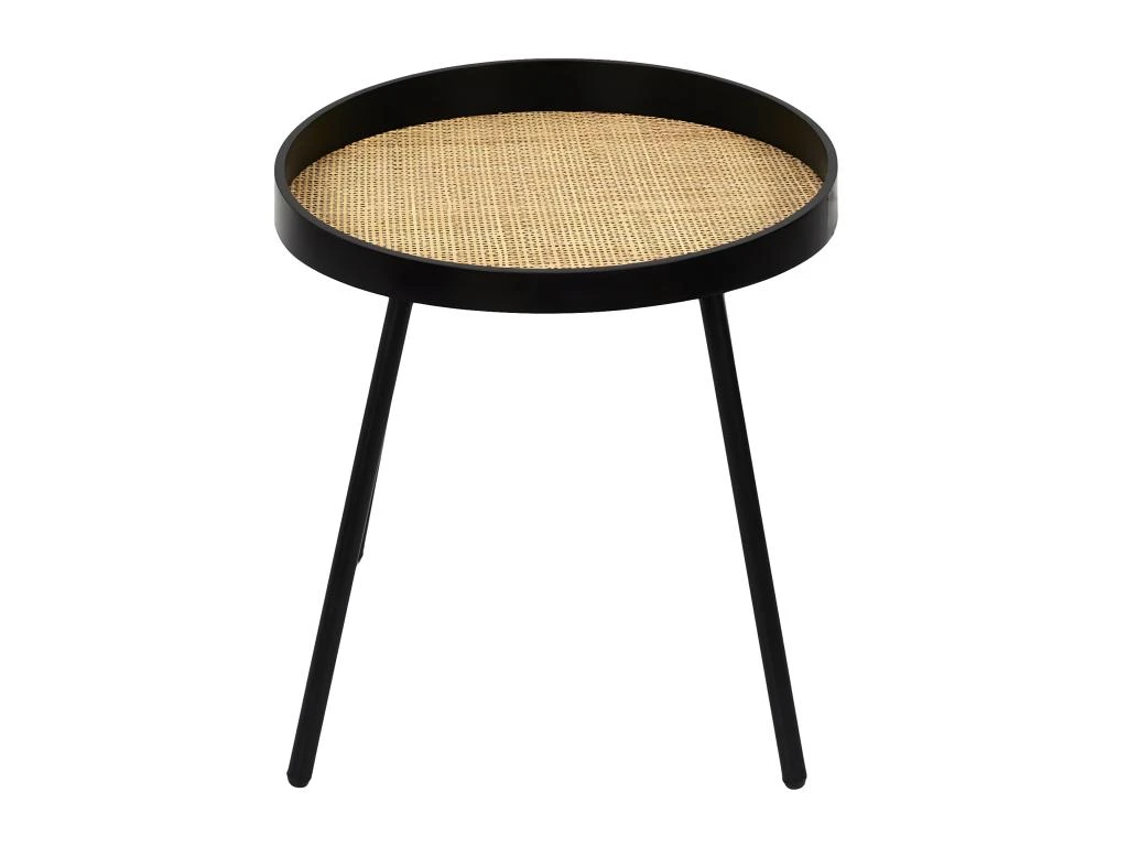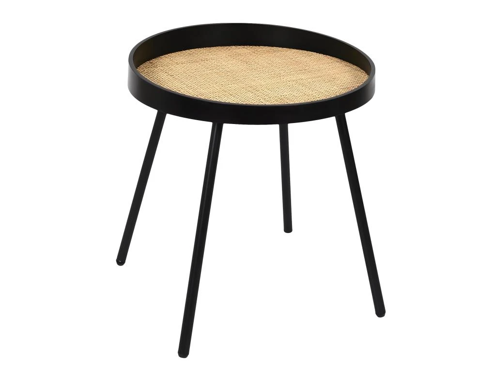 Piétement et structure métallique coloris noir. Fond de plateau en rotin.