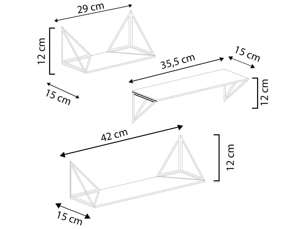 · Grande étagère murale: Hauteur 12 cm, Longueur 42 cm et Largeur 15 cm.