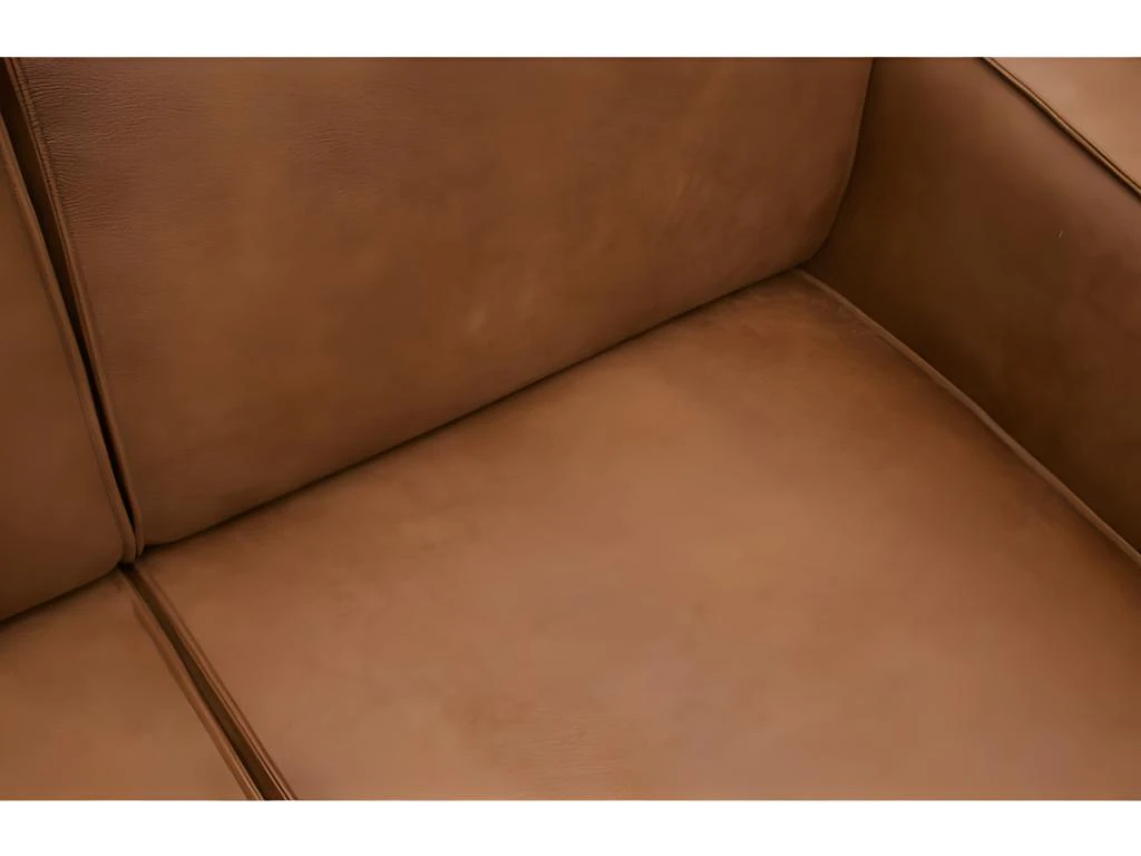 Ce canapé d’angle spacieux et confortable offre beaucoup de place pour toute la famille. Il est robuste et se décline en plusieurs variantes, tissus et couleurs. Cette version est en cuir recyclé couleur marron cognac.