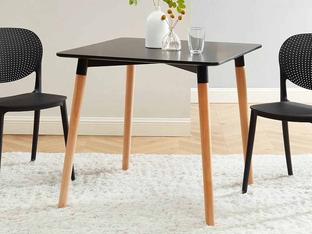 La table à manger CARISELA offre un plateau carré en MDF, soutenu par quatre pieds en bois de hêtre. Idéale pour les petits espaces, elle pourra accueillir 2 couverts.