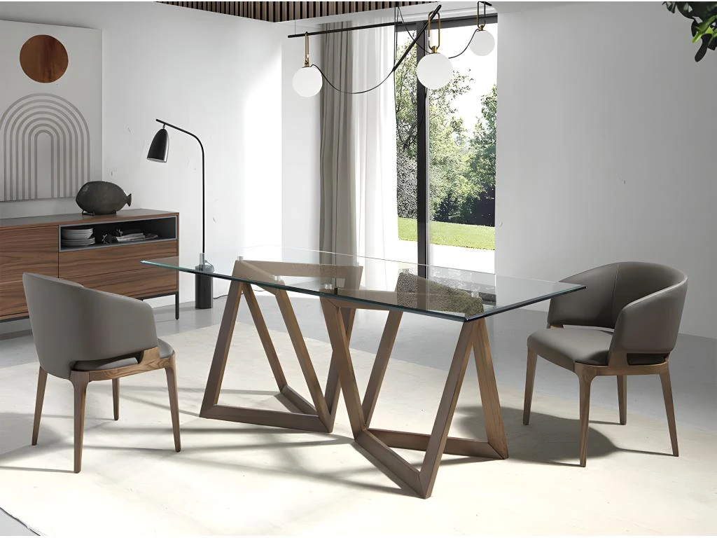 Table de salle à manger de style moderne avec plan fixe rectangulaire en verre trempé de 12mm avec bords biseautés. Ses deux pieds rectangulaires en frêne massif couleur noyer apportent chaleur et avant-garde à votre pièce. En outre, grâce à cette structure originale en bois de noyer, la sensation d’espace et de légèreté sera beaucoup plus grande. Chaque détail est pensé pour vous offrir le meilleur confort, ainsi qu’une pièce design pour votre salle à manger