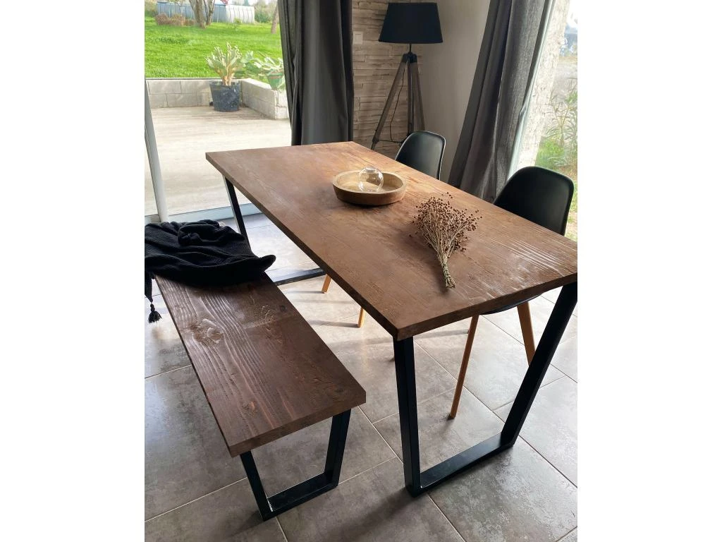 Table en bois de pin massif naturel avec un traitement vernis incolore mat.