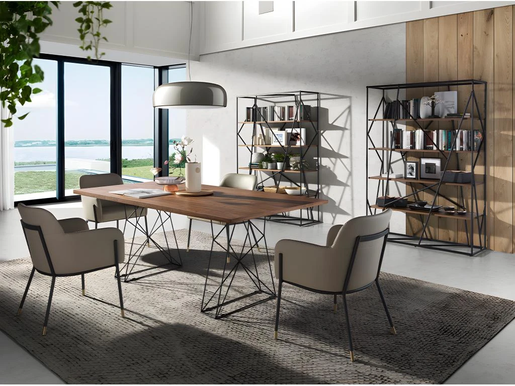 Table de salle à manger avec plateau rectangulaire fixe en placage de noyer naturel de 0,5 mm d’épaisseur. Elle possède une structure originale de pieds en acier inoxydable époxy noir qui vous donnera le style moderne et innovant que vous recherchez dans votre maison. Chaque détail a été pensé pour vous offrir le plus grand confort, ainsi qu’une pièce design pour votre salle à manger