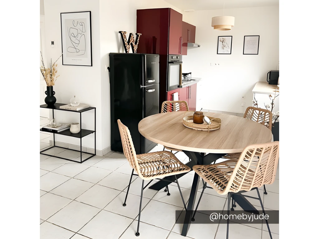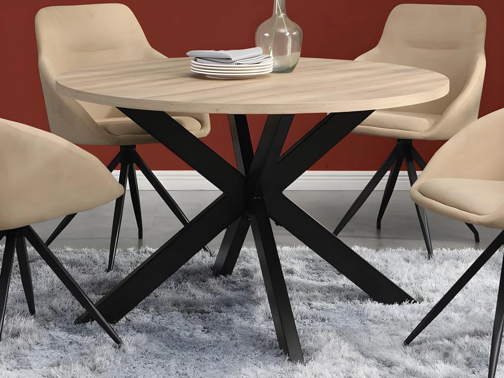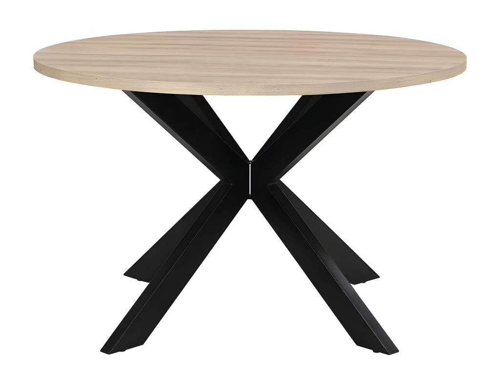 Idéale pour accueillir vos amis pour un moment convivial, la table TILKI vous offre un beau plateau solide en MDF et de couleur chêne. Il est soutenu par quatre pieds croisés en métal noir de finition matte.