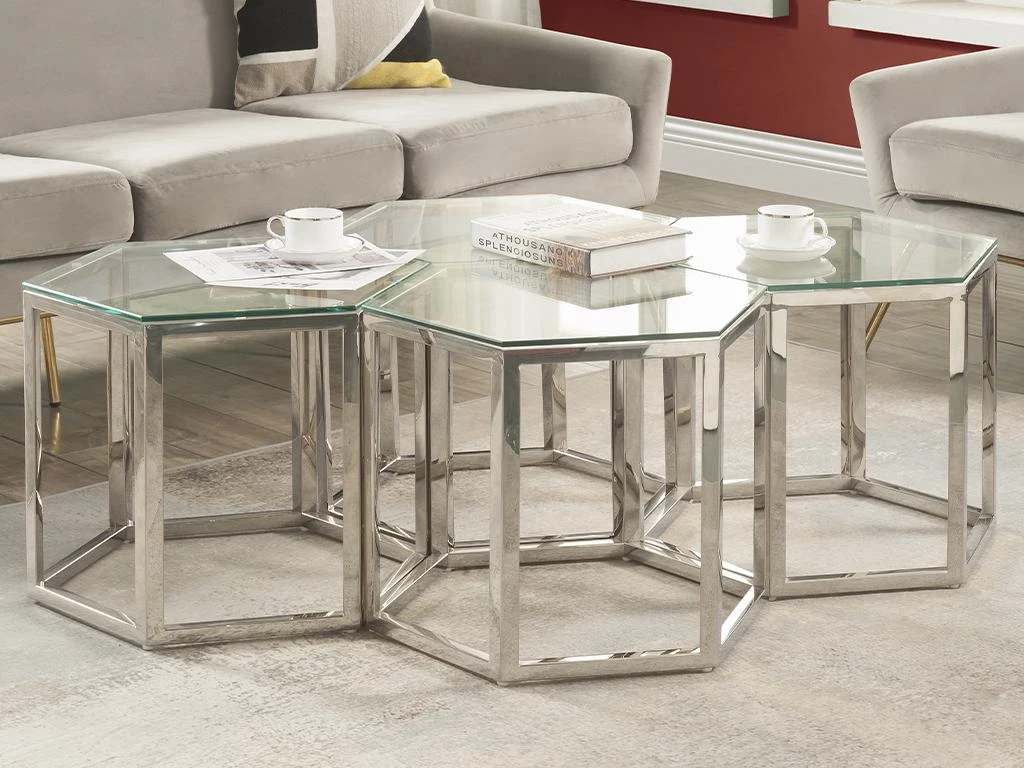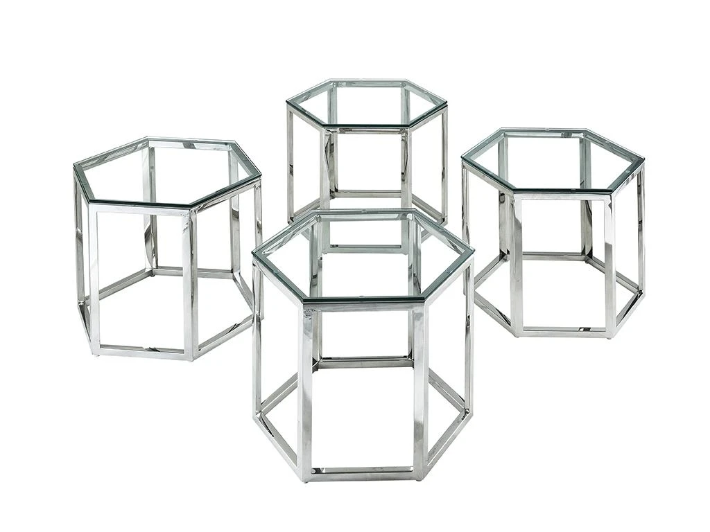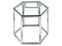 Avec son plateau hexagonal en verre trempé allié à son piètement en acier chromé ou doré, la table basse GALADRIEL apportera modernité et originalité à votre intérieur.