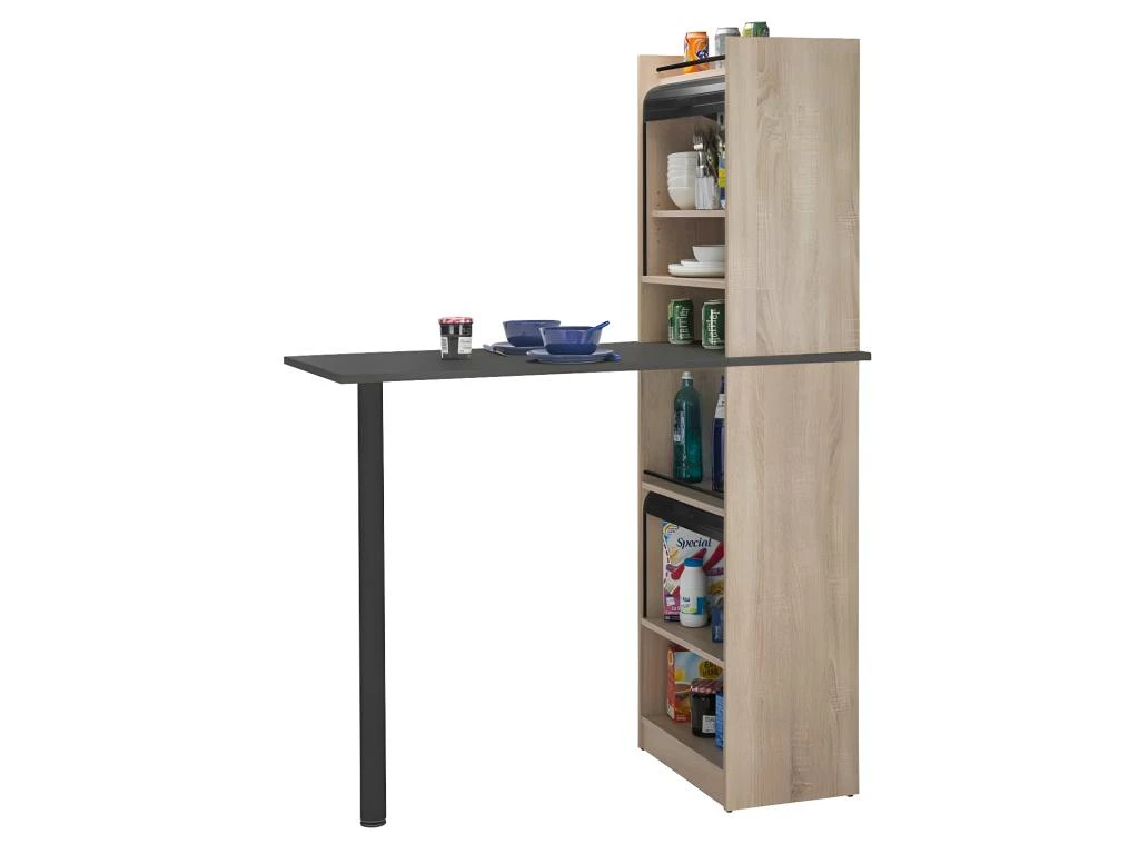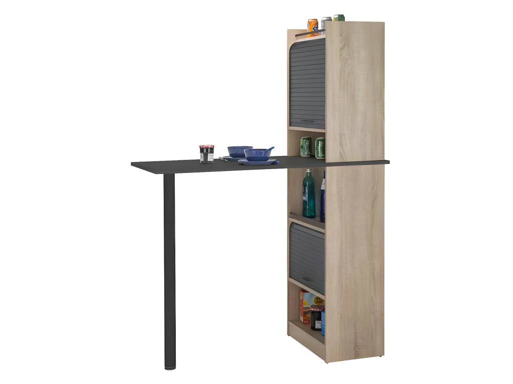 Aménagez une petite cuisine avec ce meuble multi-fonctions intégrant un comptoir/table mange debout et un caisson de rangement à rideaux coulissants.