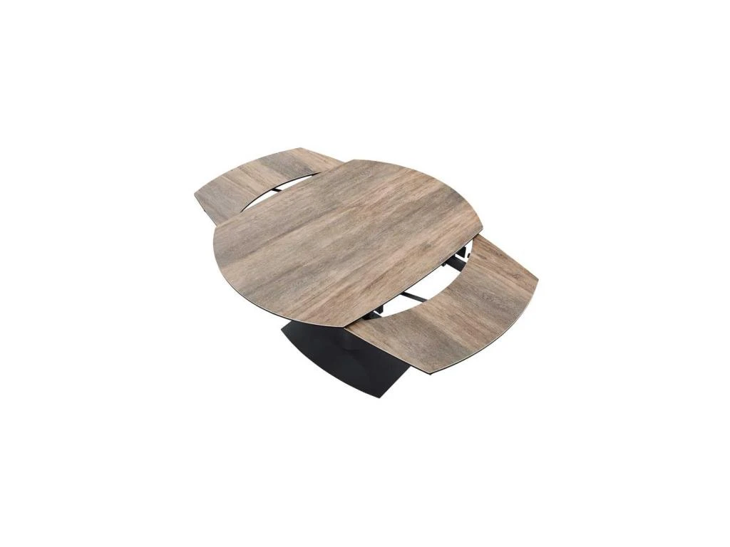 Gage d’un potentiel décoratif exceptionnel et d’une stabilité rassurante cette table de repas à allonges bout de table intégrées repose sur un piétement central en métal.