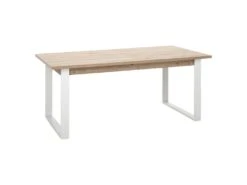 - PRODUIT : Table de repas extensible 180/240 cm finition chêne clair texturé avec piètement luge en métal blanc VERONICA.