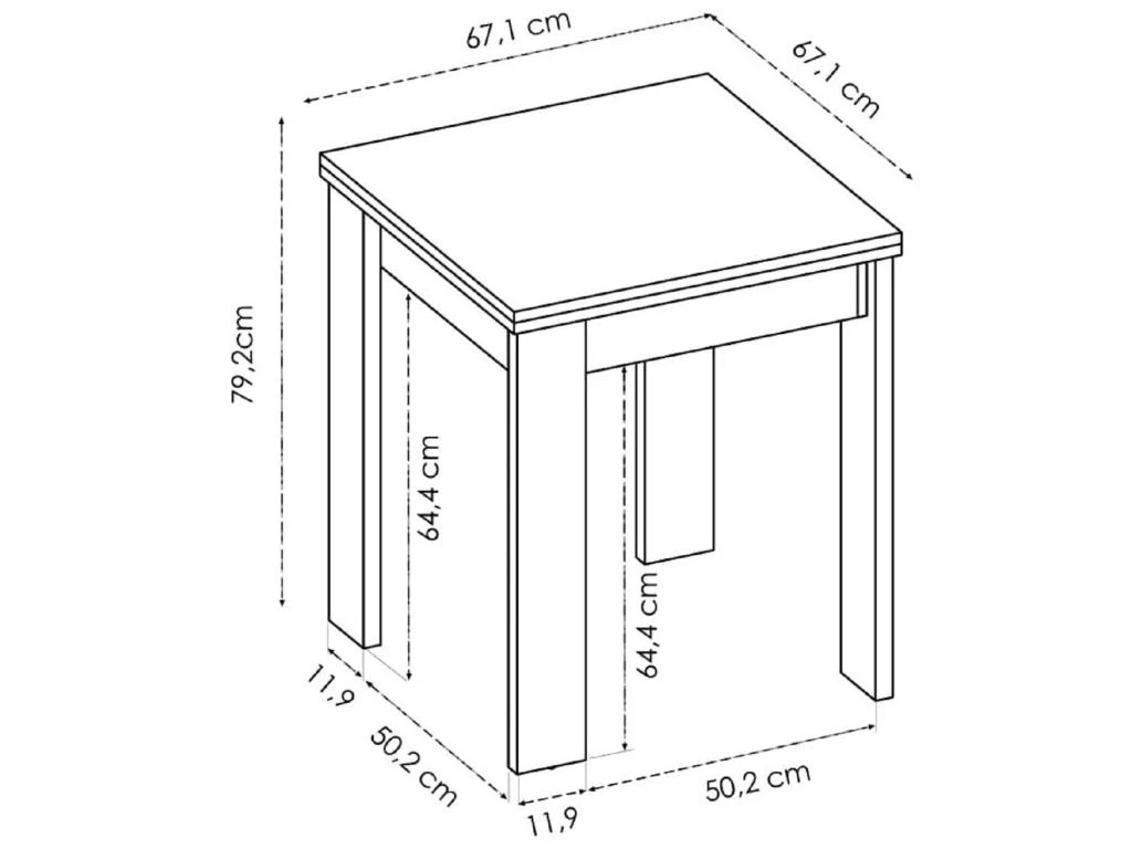 – Table : Longueur 67.1-134.2 x Profondeur 67.1 x Hauteur 77.3-79.2 cm