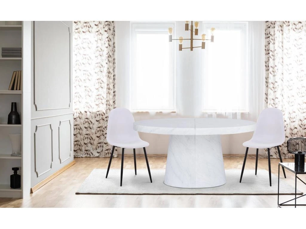 La table de salle à manger OLUZE est une table au design très sobre et néanmoins très chic. Table stable grâce à son gros pied central cylindrique. Vous pourrez vous y installer à plusieurs très confortablement en y plaçant 3 rallonges. Robustesse et stabilité seront au rendez-vous pour tous vos repas du quotidien !