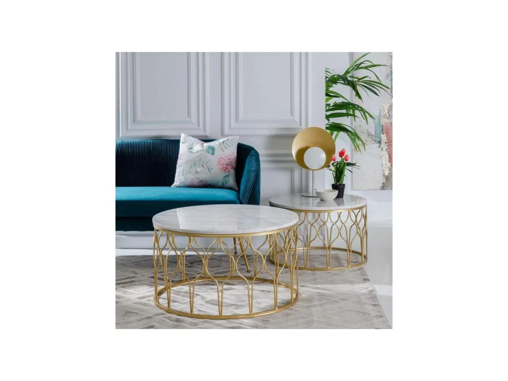 Parfaitement soutenu par un piétement en métal Or au design inspiré chacun des plateaux de ces tables est réalisé en marbre Blanc de Carrare, la très belle qualité perçue de ce duo de tables de salon n’a d’égale que leur stabilité et leur robustesse.
