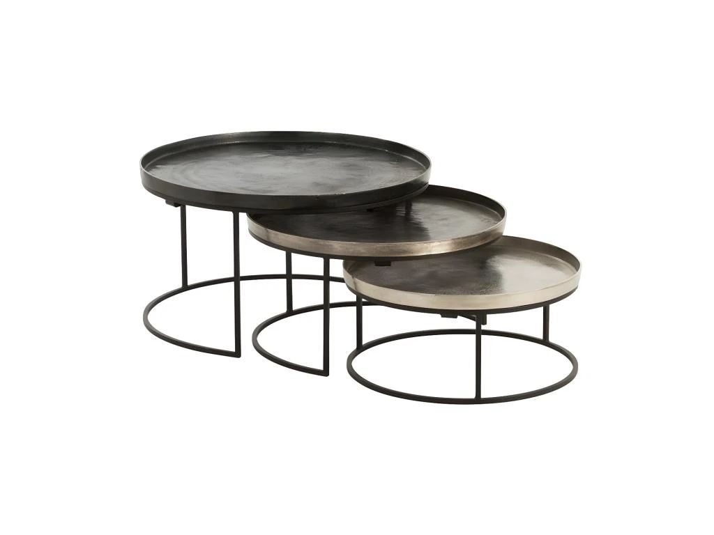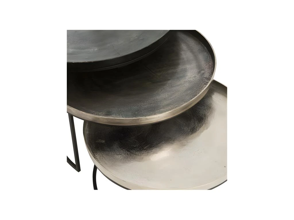 Lot de 3 tables gigognes rondes avec plateau en Aluminium au panachage de teintes noires et argentées patinées.