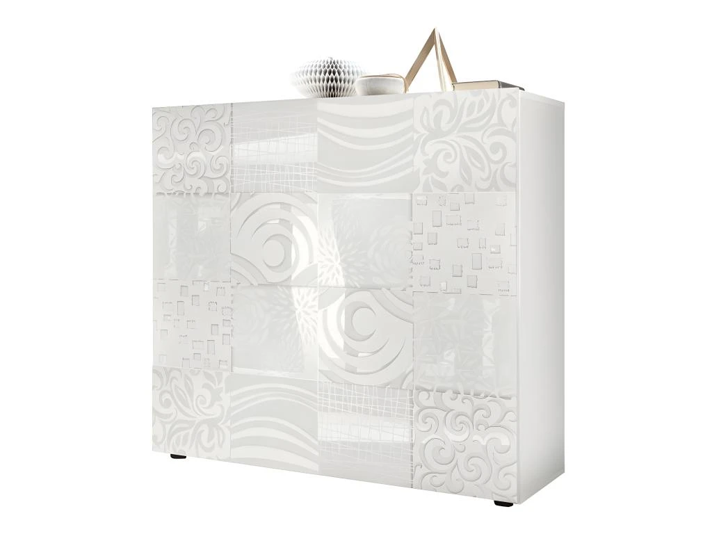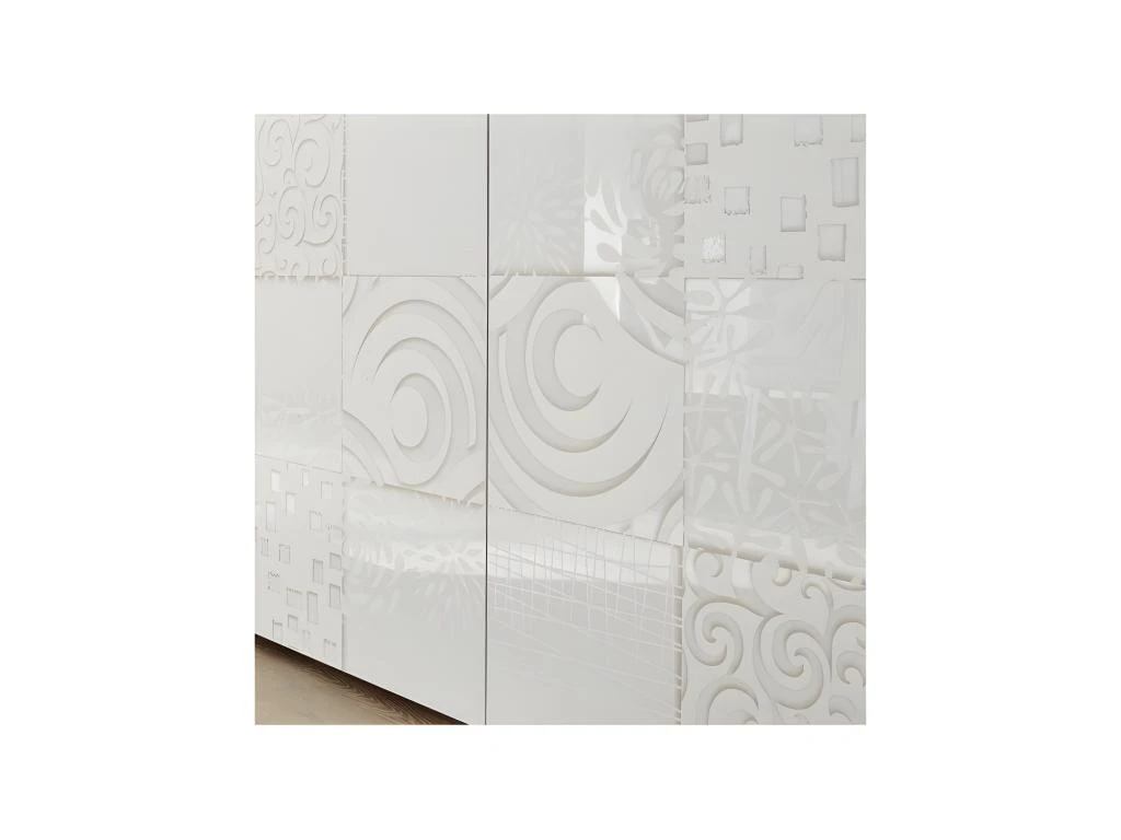 Cette armoire de salon contemporaine au format original met en avant une façade sérigraphiée de motifs variés qui sont mis en relief par la véritable laque Blanc ultra haute brillance.