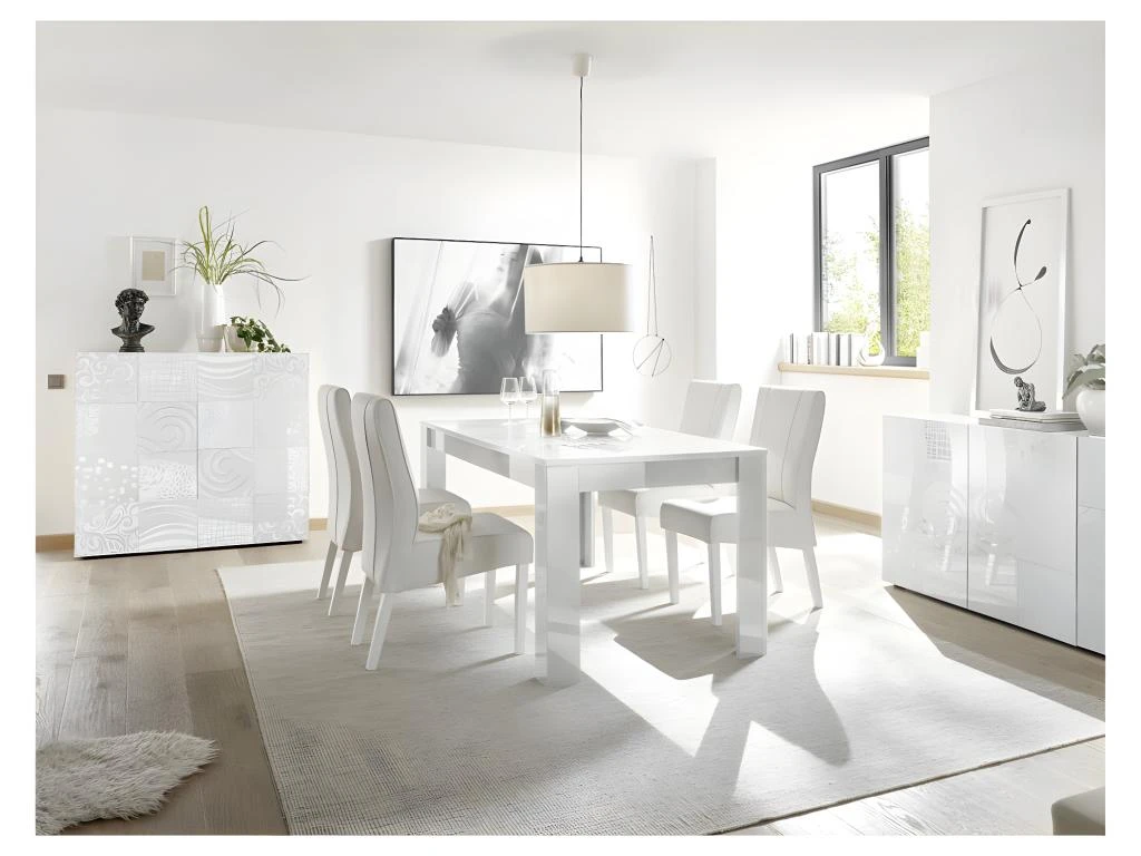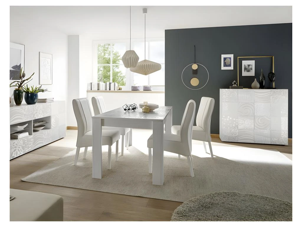 Teinte très lumineuse, ligne contemporaine et sérigraphie exclusive garantissent à ce vaisselier 2 portes moderne de faire forte impression dans votre salle à manger ou votre salon.