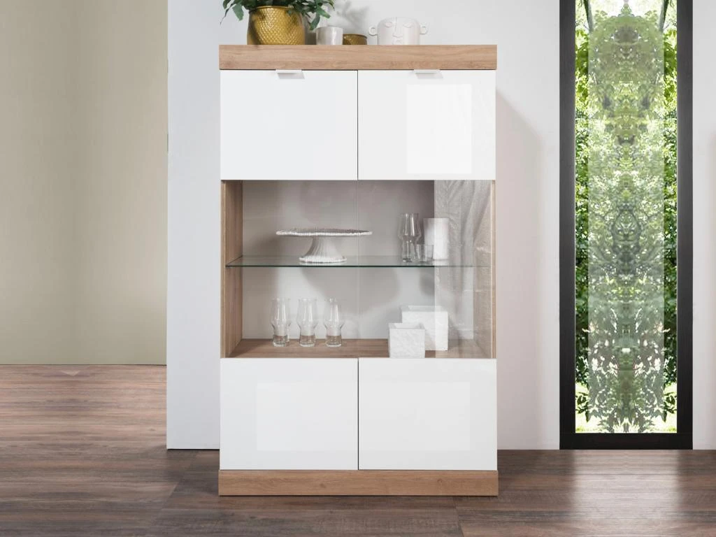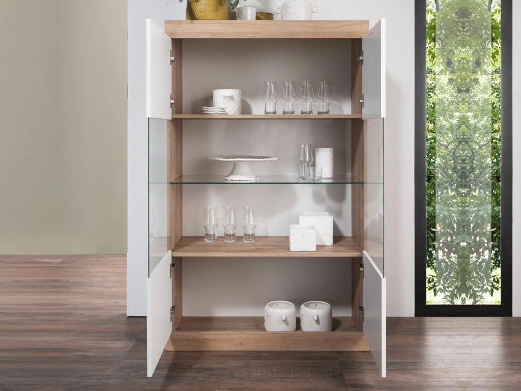 La collection EVOLIA propose un alliage de coloris très tendance : du blanc laqué ainsi que du naturel mélaminé. De plus, le design de cette collection est pensé de manière à vous offrir de nombreuses possibilité de rangement.